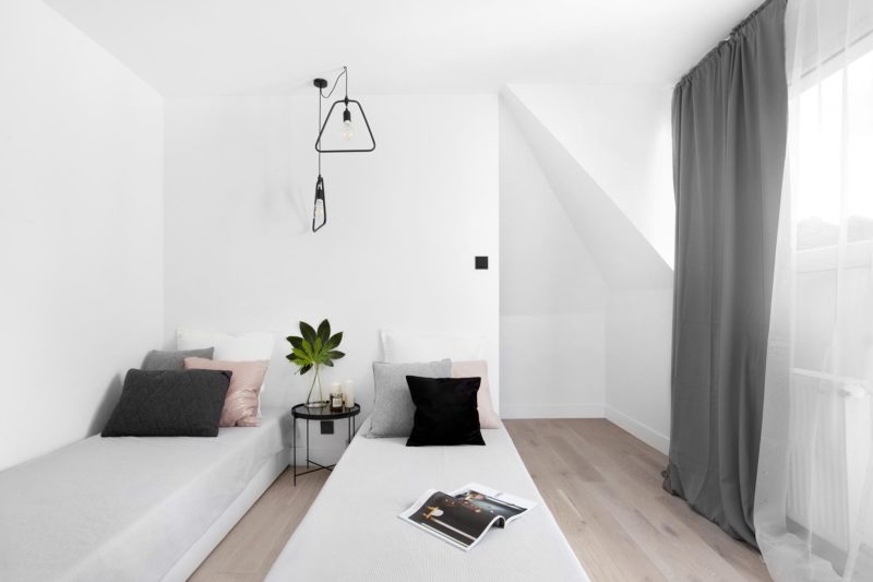 Z racji tego, że mieszkanie mieści się na poddaszu pojawiły się trudności z wyborem odpowiednich szaf. Architektki postanowiły w dwóch sypialniach wyodrębnić garderoby, dzięki czemu właściciele mają więcej miejsca na swoje rzeczy. Mieszkanie wypełnione jest roślinnością i licznymi dodatkami. Uzupełnieniem aranżacji są fototapety.
