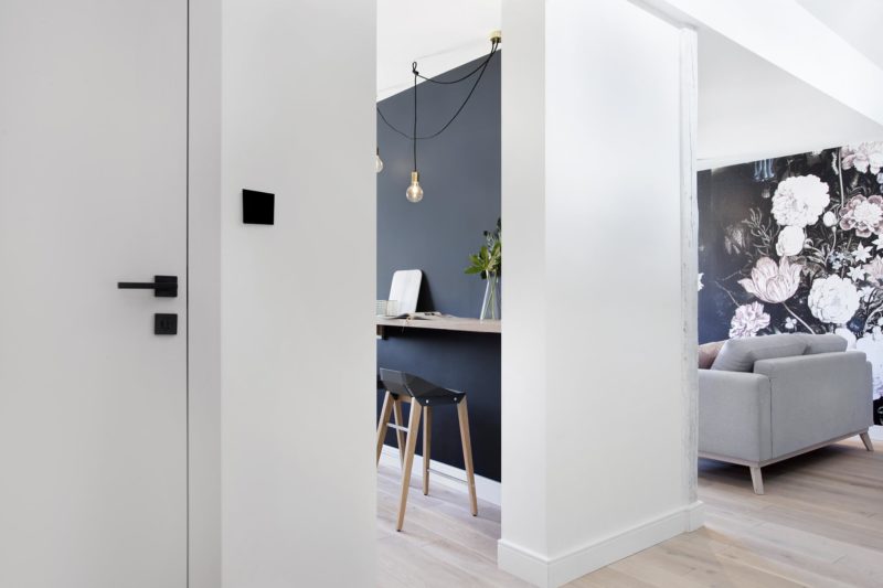 Mieszkanie posiada wysokie sufity, dzięki czemu jest bardzo dobrze doświetlone. Jest jeszcze jeden plus – przestronność mimo, że mieszkanie znajduje się na poddaszu. Architektki nie wprowadziły dużych zmian w układzie. Zdecydowały się na otwarcie przestrzeni w przedpokoju, aby podkreślić wysokość. Wchodząc do mieszkania od razu ma się poczucie, że jesteśmy w nowoczesnym i przestronnym mieszkaniu, co dodatkowo podkreśla otwarta kuchnia.
